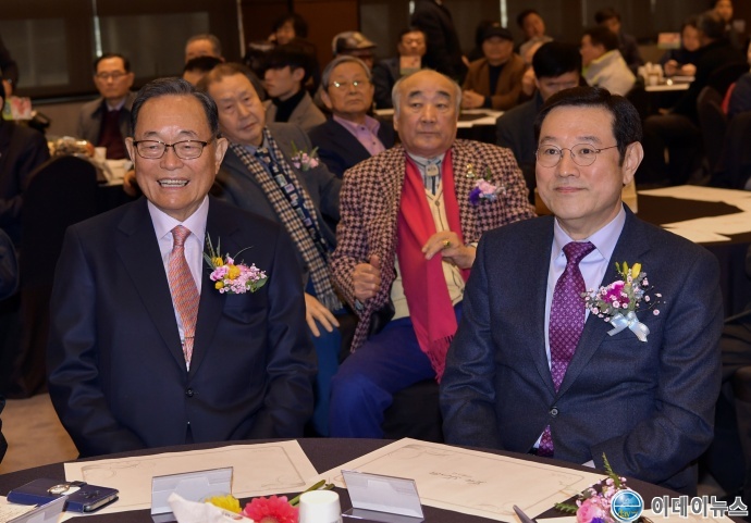 이용섭 광주광역시장(오른쪽)이 22일 오전 서구 라페스타웨딩홀에서 열린 제10대 (사)광주예총 광주광역시연합회장 취임식에 참석해 임원식 신임회장(왼쪽)과 행사를 지켜보고 있다.