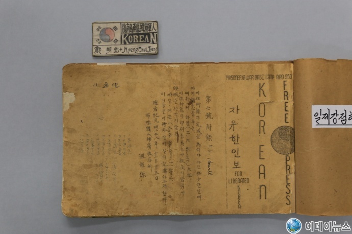 먼저 일제에 징용돼 남양군도 등에서 미군 포로가 됐던 한인 징용자들이 만든 주간지 자유한인보 제7호 부록(명부, 태극문양 포함, 1945년), 태극기가 들어간 군인 명찰(해남도남구한적군인명찰, 1945년) 원본(국립일제강제동원역사관 제공)이 전시된다.