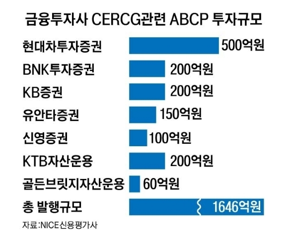 지난 26일 경찰과 금융업계 등에 따르면, 한화투자증권은 특수목적회사(SPC) `금정제십이차`를 통해 CERCG의 역외 자회사(CERCG캐피탈)가 발행한 회사채 1억5000만 달러를 담보(기초 자산)로 삼은 ABCP(1646억 원)를 발행해 현대차증권(500억 원), KB증권(200억 원) 등 국내 증권사들에게 팔았다.