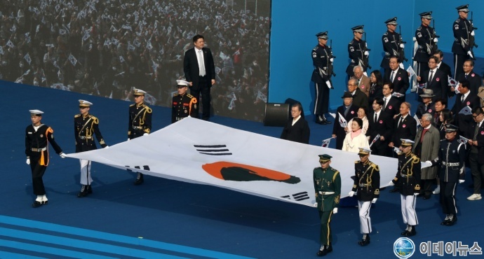 문 대통령은 11시 33분∼11시 57분까지 약 24분간 기념사를 통해 대한민국 새로운 100년의 화두로 이른바 ‘신(新)한반도 체제와 포용국가’의 비전을 제시했다.