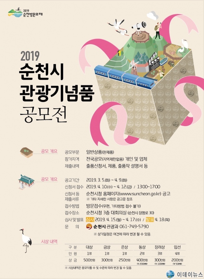 순천시에서는 지역의 전통과 역사, 문화 등 순천 고유의 특징을 알릴 수 있는 ‘2019 순천시 관광기념품 공모전’을 개최한다.