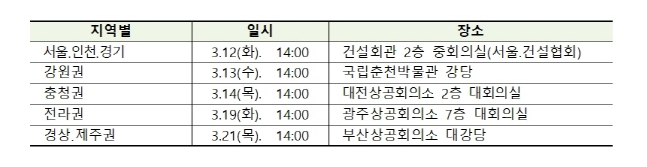 개정설명회는 약 2주 동안 5개 권역(서울ㆍ인천ㆍ경기, 강원, 충청, 전라, 경상ㆍ제주)에서 개최될 예정이며, 상세일정 및 내용은 건설연 공사비원가관리센터 홈페이지에서 확인할 수 있다.