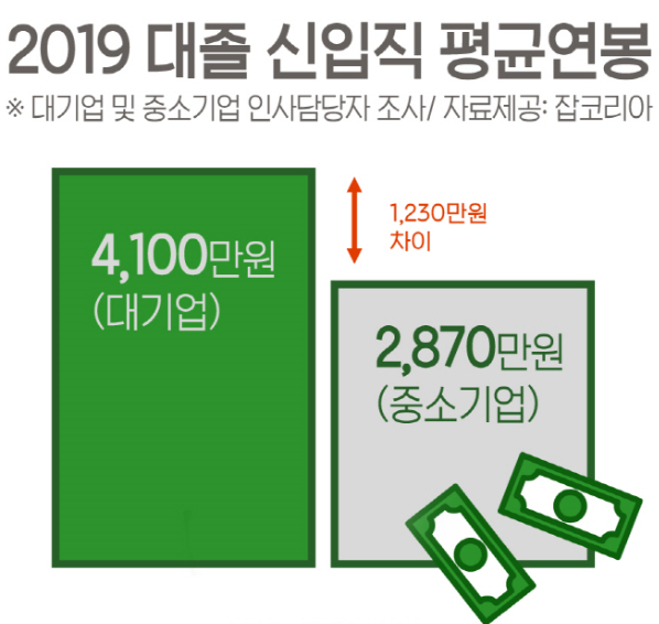 대기업과 중소기업의 신입직 연봉 격차는 1230만 원으로 지난해 양 기업 간 격차(1250만 원)와 비교해 줄어들었으나 여전히 1000만 원 이상이었다.