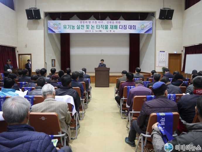 나주시(시장 강인규) 지난 14일 제2청사 농업기술센터 대강당에서 ‘2019 유기농 실천 및 논 타작물 재배 다짐대회’를 갖고, 농업인의 안전한 먹거리 생산과 식량 자급률 향상 등을 위한 굳은 결의를 다졌다.
