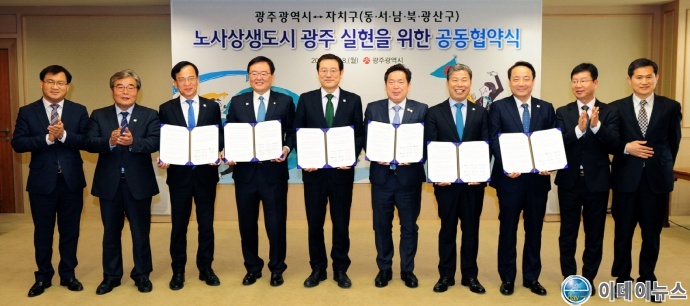 이용섭 광주시장과 임택 동구청장, 서대석 서구청장, 김병내 남구청장, 문인 북구청장, 김삼호 광산구청장은 18일 광주시청 비즈니스룸에서 ‘노사상생 도시 광주’ 실현을 위한 공동협약서에 서명하고 적극 힘을 모으기로 했다.