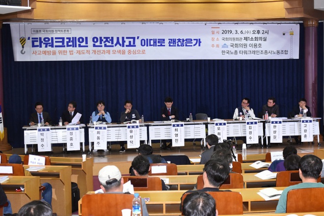 이용호 무소속 의원과 한국노총 전국연합노동조합연맹 한국타워크레인조종사노동조합(위원장 유상덕)은 3월 6일, 14시, 국회의원회관 제1소회의실에서 ‘타워크레인 안전사고 이대로 괜찮은가 : 사고예방을 위한 법·제도적 개선과제 모색을 중심으로’ 정책토론회를 개최하고 최근 무분별하게 도입되고 있는 무인 타워크레인이 공사 현장의 시한폭탄으로 작용함에 따라 건설노동자와 국민들의 안전과 생명을 위협하고 있는 상황에서 법·제도적 개선과제를 모색하기 위해 마련된 자리였다.