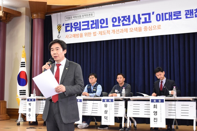 이용호 의원은 개회사를 통해 “건설현장에서 타워크레인에 대한 의존도가 절대적이기 때문에 관리가 허술하게 이뤄질 경우 대형 사고로 이어질 위험이 크고, 사고에 사망자가 발생했는지 여부가 안전을 판단하는 기준이 되어서는 안되며, 이번 토론회는 우리나라의 허술한 타워크레인 제작 기준을 보다 명확히 할 수 있는 방안을 논의하고, 노동자가 사고위험으로부터 마음 놓고 일할 수 있는 안전한 건설 현장을 조성하는데 큰 도움이 될 것이라고 기대한다”고 밝혔다.
