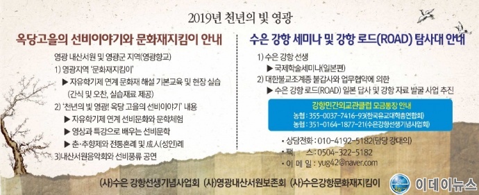수은 강항선생기념사업회(회장 박석무)와 영광내산서원보존회(회장 강재원)에서는 오는 4월 2일부터 영광지역민들과 초, 중, 고교생들을 위한 인성교육과 문화재지킴이 기본교육, 국제학술세미나 및 강항 로드(ROAD) 등을 2019년 12월까지 매월마다 아래와 같이 운영한다. ▶ 영광 내산서원 및 영광군 지역(영광향교) 1) 영광지역‘문화재지킴이’