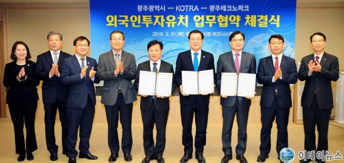 광주시와 KOTRA, 광주테크노파크는 21일 오후 광주시청 비즈니스룸에서 지역경제 활성화와 일자리 창출을 위한 ‘외국인 투자유치를 위한 협약’을 체결했다.
