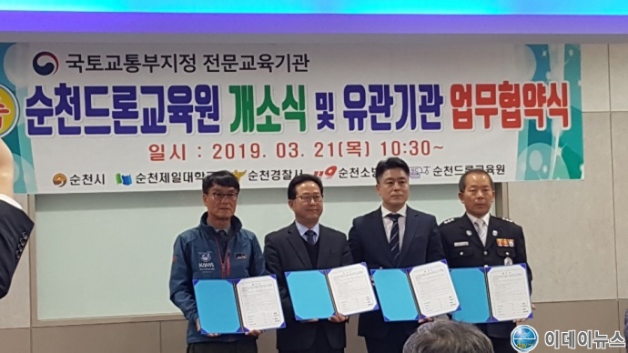 2018년부터 순천시에서는 드론의 중요성에 대하여 공감하고 있는 제일대학교와 함께 전문교육기관 지정을 위한 업무협약을 맺고, 순천시는 맑은물관리센터 운동장을 이․착륙 교육시설로 유상 사용허가 하고, 제일대학교는 학교 내 이론 강의실, 사무실, 휴게실을 제공하기로 해 이번 ‘순천드론교육원’을 개원하는데 지원을 아끼지 않았다.