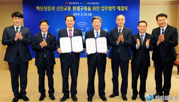 광주시와 도로교통공단은 22일 시청 3층 비즈니스룸에서 이용섭 시장, 윤종기 도로교통공단 이사장, 정준하 교통과학연구원장 등이 참석한 가운데 ‘혁신성장과 선진교통환경 구축을 위한 업무협약’을 체결했다.