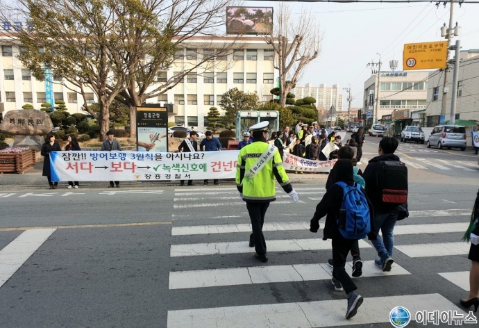 이날 캠페인은 어린이가 안전하게 길을 건너는 습관을 가질 수 있도록 캠페인을 전개하고, 장흥초교 1학년 학생 125명을 대상으로 방어보행 3원칙(서다-보다-걷다)을 주제로 이론교육을 실시하였다.
