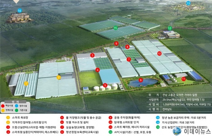 본 사업은 교육과 경영·실습형 청년보육센터를 비롯한 창농·창업을 위한임대형 스마트팜, 최첨단 농자재 검·인증 등을 위한 실증단지, 지역민과함께하는 주민 참여형 온실 조성 등 유통시설과 농촌 주거여건 개선과연계한 복합 패키지 형태로 추진될 계획이다.