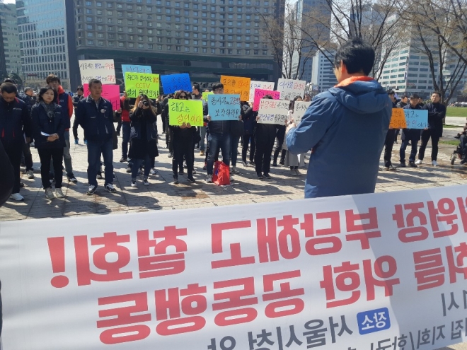 한국노총 사회서비스노동조합 향유의집 지부는 4일 서울시청 앞에서 집회를 열고 탈시설 정책에 따른 향유의집 시설종사자들의 고용안정 보장을 촉구했다.