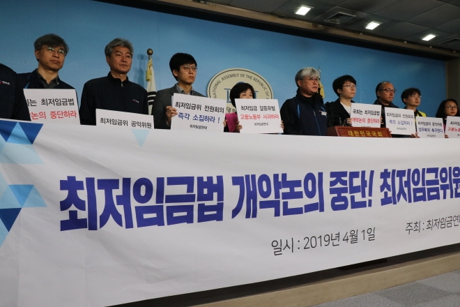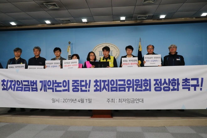 이에 한국노총 등 최저임금연대는 4월 1일(월) 오전, 국회 정론관에서 기자회견을 개최하고, 최저임금법 개악 논의 중단과 함께 최저임금위원회 정상화를 촉구했다.