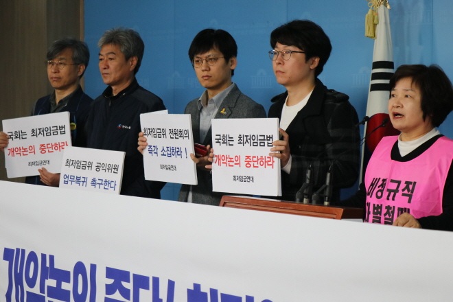 최저임금연대는 기자회견문을 통해 “국회가 ‘임금의 최저수준 보장, 노동자의 생활 안정’이라는 근로기준법 취지에 역행하고, ILO 협약 제131호 최저임금 결정 협약을 무시하는 최저임금법 개악을 추진하고 있다”면서 “사회적 갈등을 유발하는 최저임금 개악 법률안 논의를 당장 중단하고 폐기해야 한다”고 규탄했다.