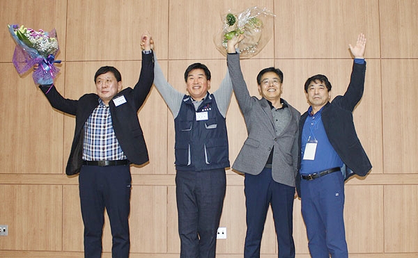 신임 전경탁 의장(사진 제일 왼쪽)은 3월 29일 한국노총 제주지역본부에서 치러진 19대 의장 보궐선거에서 54.5%(55표)를 얻어 당선됐다. 기호 2번 강종철 금융노조 제주은행지부 위원장은 45.5%(46표)를 받아 9표 차이로 패했다. 이날 투표에는 재적 대의원 104명 중 101명이 참가해 투표율 97.1%를 기록했다.
