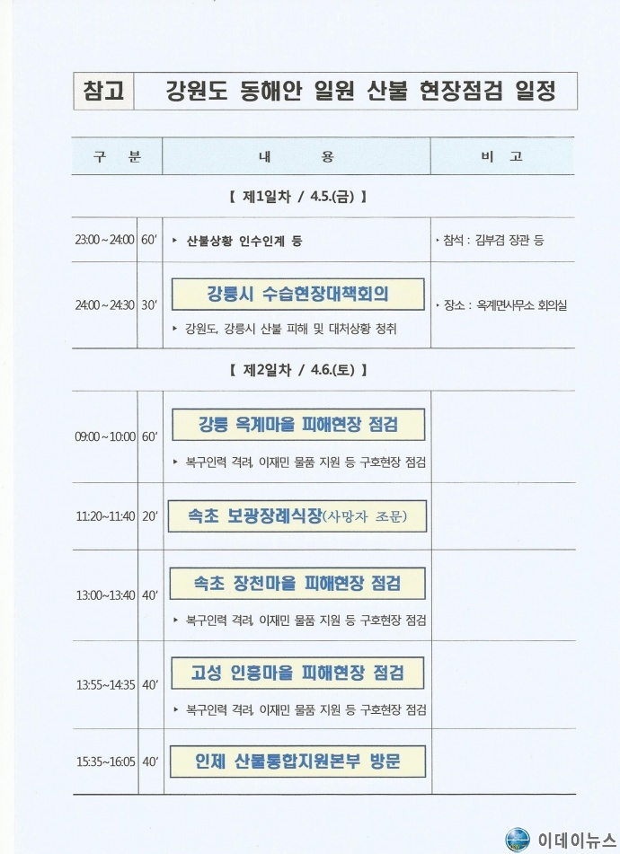 한편, 진 장관은 이번 산불로 사망한 김모씨의 빈소를 찾아 조문 및 유족을 위로하고, 속초시와 고성군‧인제군의 산불피해 현장을 점검한 후 이재민 대피소를 찾아 이재민들을 위문한다.