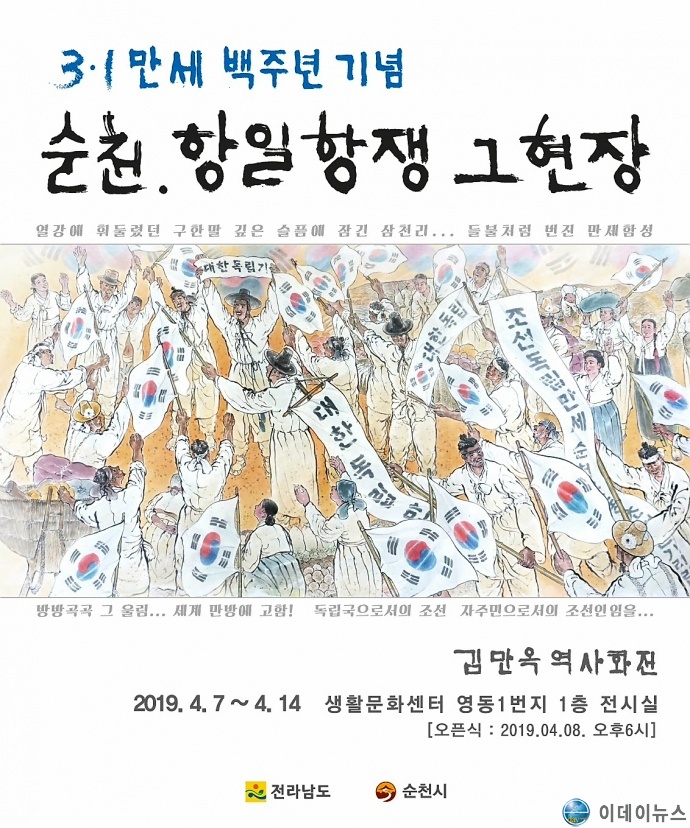 7일 순천 3.1만세 100주년 기념 ‘순천 항일 항쟁의 생생한 현장’을 담은 한국화 전시회가 7일부터 9일간 전남 순천시 중앙로 95(지번주소 : 순천시 영동 1번지) 생활문화센터 1층(전화 061-749-3939번)에서 허석 순천시장과 시민, 문화예술인 100여명이 참석한 가운데 열리게 된다.