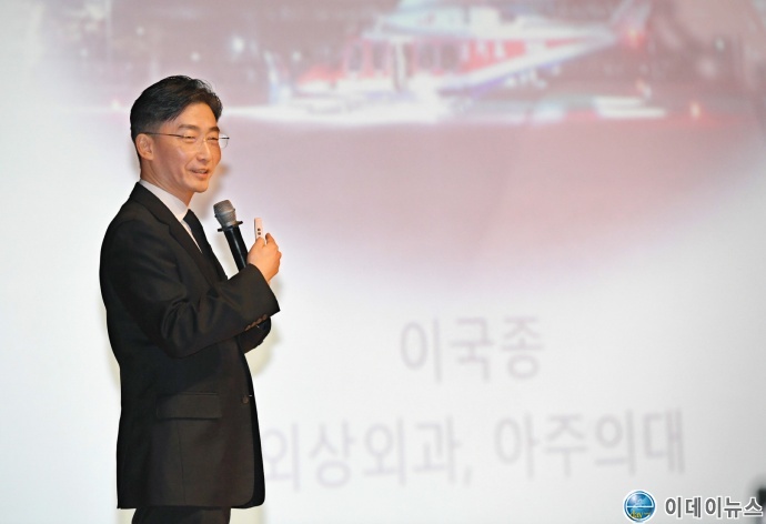 ‘Trauma Surgery(외상외과)’를 주제로 한 이날 강연에서 이 교수는 지난 9월 훈련 중 중상을 입었으나 착륙장 부재를 이유로 헬기로 40분인 거리를 4시간 동안 차량으로 이송하는 바람에 사망한 해경의 사례를 들며 응급이송 현실의 문제점을 지적하면서 강의를 시작했다.