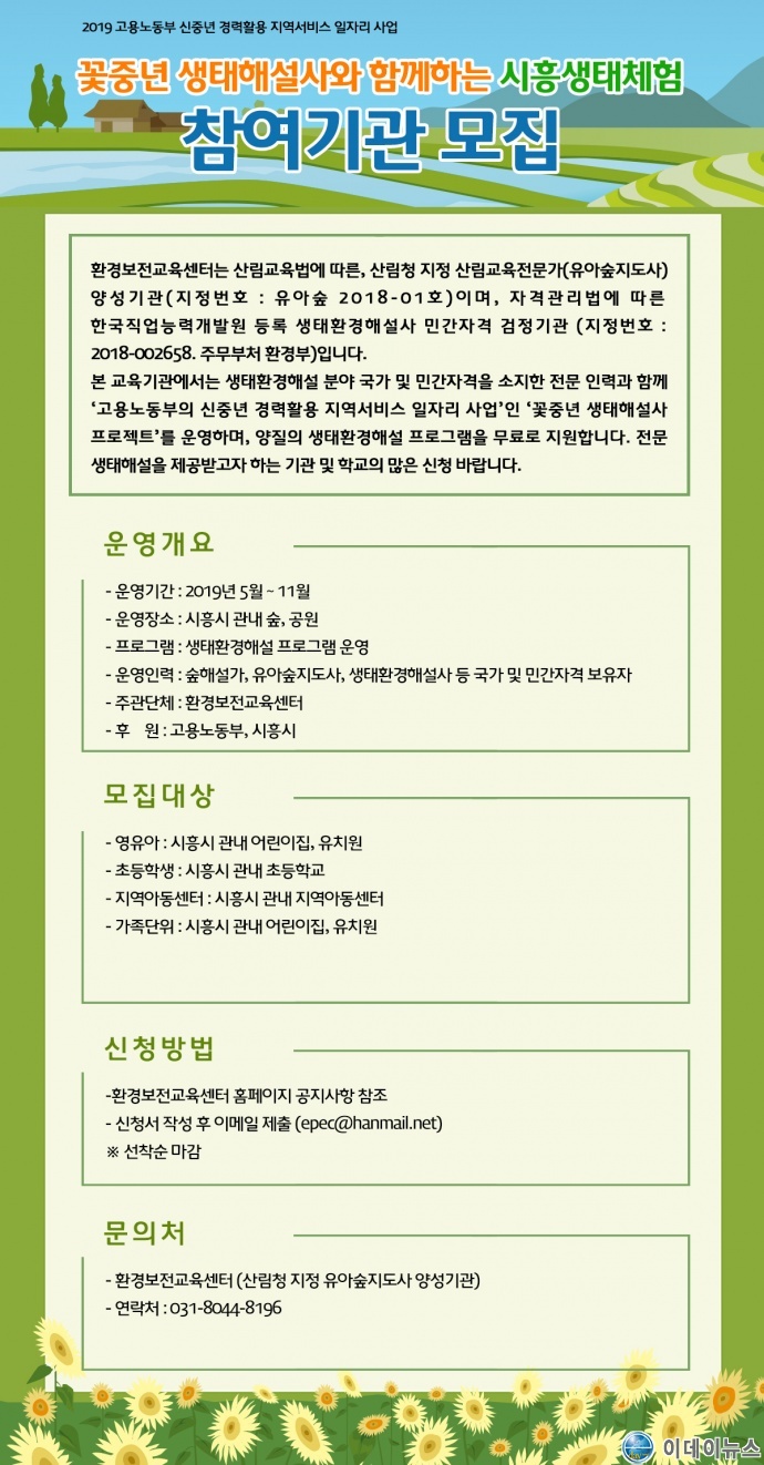환경보전교육센터는 고용노동부가 지원하는 ‘2019년도 신중년 경력활용 지역서비스 일자리 지원사업’에 선정되어, ‘꽃보다 아름다운 꽃중년 생태해설사 프로젝트’라는 사업명의 일자리 사업을 추진하며, 4월 27일부터 생태해설에 참여할 기관/단체/학교를 선착순 모집한다.