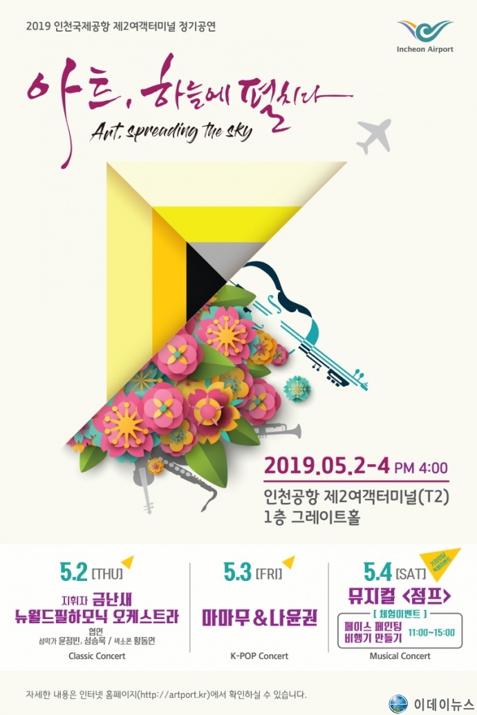 이번 공연은 5월 2일부터 4일까지 3일간 매일 오후 4시부터 1시간 동안 진행되며, 인천공항을 찾는 방문객 누구나 무료로 감상할 수 있다. 좌석예약을 원할 경우 인천공항 아트포트 홈페이지(artport.kr)를 통해 선착순으로 신청 가능하며, 자세한 사항은 제2여객터미널 문화예술사무국(032-741-7881)에 문의하면 된다.