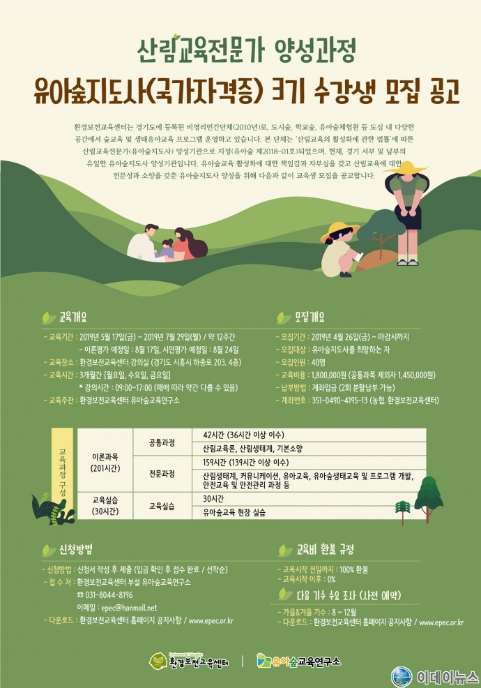 환경보전교육센터(부설 유아숲교육연구소)는 ‘산림교육 활성화에 관한 법률’에 따른 산림청 지정 ‘유아숲지도사 양성기관’으로 유아숲교육 전문인력을 양성하는 ‘유아숲지도사 3기 양성과정’을 개설한다. 산림청에서 발급하는 유아숲지도사 국가자격증을 취득하면 산림청 및 자치단체에서 운영하고 있는 유아숲체험원에서 유아숲교육 전문인력으로 활동할 수 있다. 또한 어린이집 및 유치원에서 운영하는 숲 반의 ‘숲 선생님’으로도 활동이 가능하다. 산림교육전문가에는 숲해설가, 유아숲지도사, 숲길등산지도사가 있지만 유아숲체험원에서는 유아숲지도사만 활동할 수 있다.