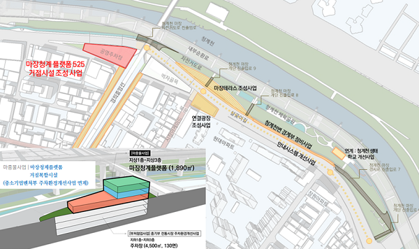 `마장청계플랫폼 거점복합시설`은 마장동 525번지(1704㎡) 내 연면적 4500㎡, 지하3층~지상3층 규모로 조성되는 재생거점시설이다. 지하엔 주민과 상인들이 지속적으로 요구했던 주차장(130면)이 들어서고, 지상엔 그린푸줏간 등 시장지원시설, 창업자를 지원하기 위한 판매시설, 식육가공전문교육장, 주민공동체공간, 식문화복합공간 등이 검토되고 있다. 주민공청회 및 관련 심의 등을 통해 구체적인 용도가 확정될 예정이다.