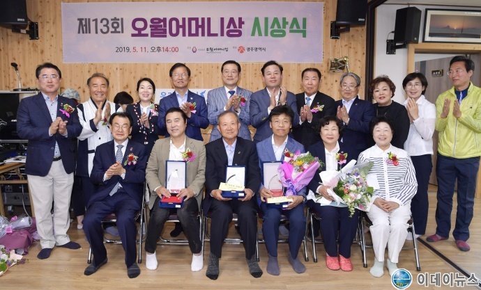 이용섭 광주광역시장이 11일 오전 남구 양림동 (사)오월어머니집에서 열린 '제13회 오월어머니상 시상식'에 참석해 정현애 이사장을 비롯, 박종주 안중근 의사 기념사업회 광주전남지부장, 문현승 운림중학교 교사, 김원중 오월음악 대표 등 수상자 등과 기념촬영을 하고 있다.