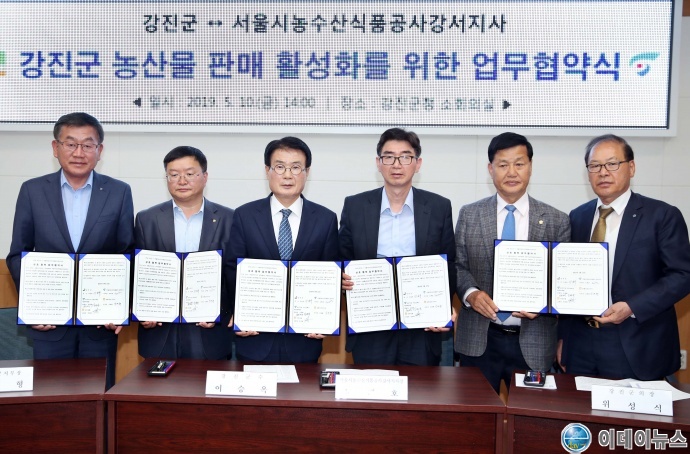 강진군이 지난 10일 강진군청 소회의실에서 60여명이 참석한 가운데 강진군(군수 이승옥)·서울농수산식품공사강서지사(노계호 지사장)· 강서시장시장도매인발전위원회(김동환 위원장)·농협강진군지부(강대형 지부장)·강진농협(정옥태 조합장)과 5자간 업무협약을 체결했다.