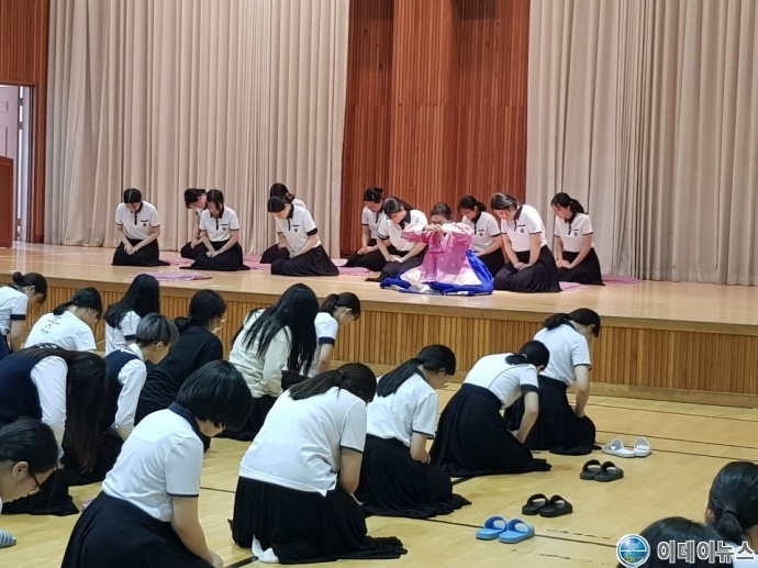 문정여자고등학교(교장 김상돈)는 2학년 학생들을 대상으로 5월 13일(월) 오후 2시40분부터 강당에서 ‘전통 성년례(계례)’를 가졌다.