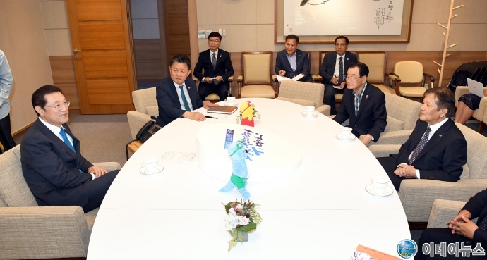 이용섭 광주광역시장이 14일 오후 시청 3층 접견실에서 전두환 씨의 5·18 사격 명령설을 주장한 김용장 전 미 육군 501정보단 요원을 면담하고 격려 했다.