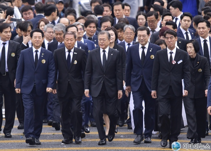 문재인 대통령과 김정숙 여사, 이용섭 광주광역시장, 김영록 전남도지사 등 주요내빈들이 18일 오전 북구 운정동 국립5·18민주묘지에서 거행된 '제39주년 5·18민주화운동 기념식'에 참석하기 위해 묘역으로 들어서고 있다.