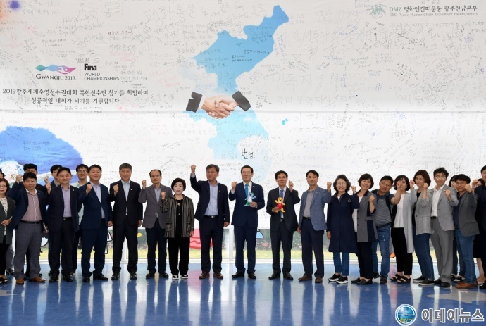 27일 제막식에 참가한 이용섭 시장은 “‘DMZ 평화인간띠 잇기 행사’와 ‘시민의 염원이 담긴 대형현수막 전시 행사’가 계기가 돼 북한 선수단, 예술단, 응원단이 수영대회에 꼭 참가하게 되길 기원한다”고 밝혔다.