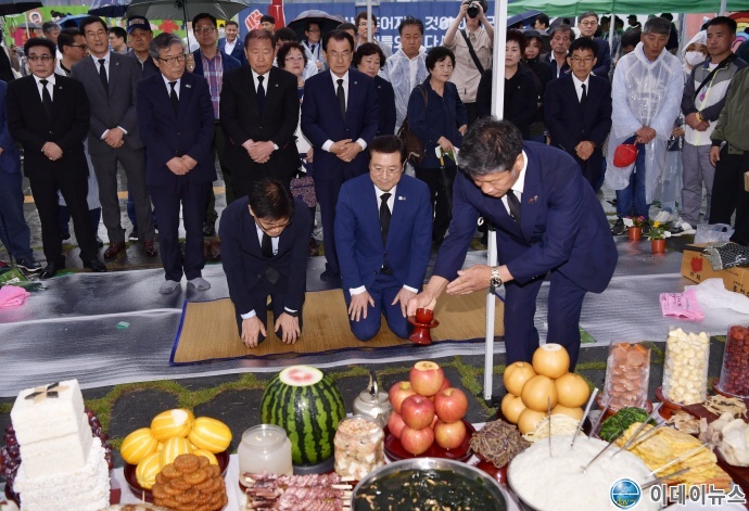 이용섭 광주광역시장이 27일 오후 동구 5·18민주광장에서 열린 '제39주년 5·18민중항쟁 기념 부활제'에 참석해 김후식 행사위원회 상임위원장, 장휘국 광주시교육감, 하유성 광주지방보훈청장 등과 오월 영령들을 추모하고 있다.