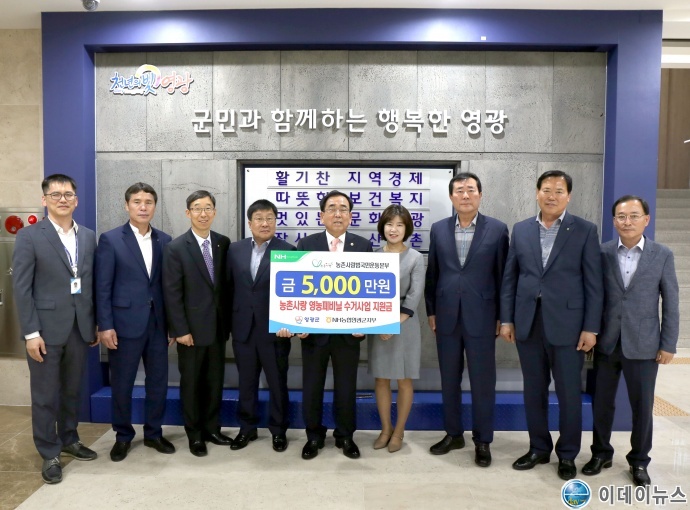 영광군(군수 김준성)은 (사)농촌사랑범국민운동본부와 농협중앙회 영광군지부로부터 영농폐비닐 수거사업 기부금 5,000만원을 지난 달 5월 31일 전달 받았다.