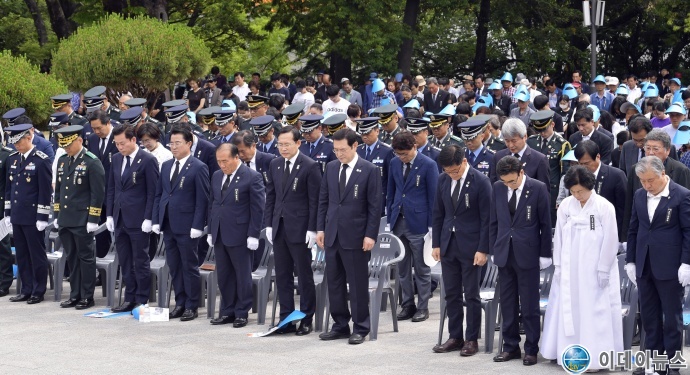 이용섭 광주광역시장이 6일 오전 남구 광주공원 현충탑에서 열린 '제64회 현충일 추념식'에서 김동찬 광주시의회 의장, 장휘국 광주시교육감, 하유성 광주지방보훈청장, 국가유공자, 유족 등 참석자들과 순국선열 및 호국영령의 명복을 비는 묵념을 하고 있다.