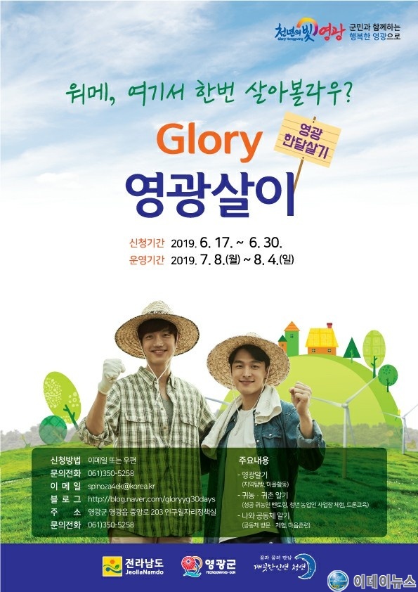 신청은 영광군 홈페이지와 블로그(https://blog.naver.com/gloryyg30days)에 게시된 참가지원서를 작성해 이메일(spinoza4ek@korea.kr)로 제출하면 되고 궁금한 사항은 인구일자리정책실(061-350-5258)로 문의하면 된다.