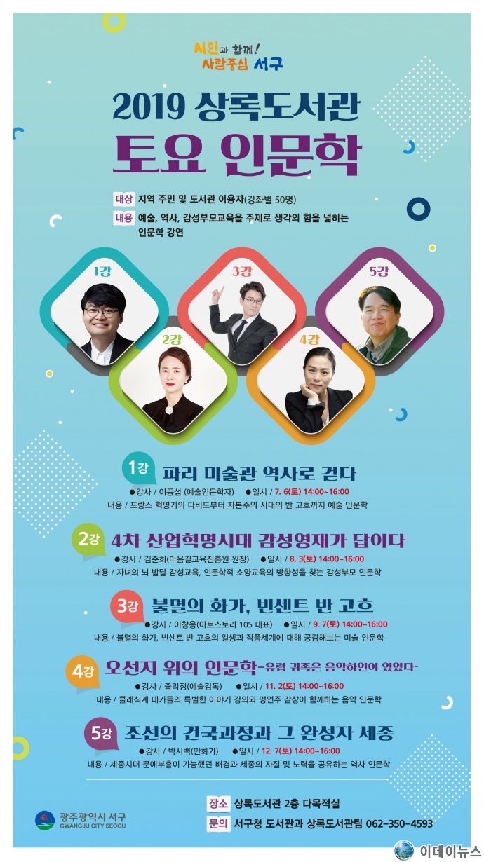 광주 서구(구청장 서대석) 상록도서관이 7월부터 12월까지 주말 인문학 강좌『토요 인문학』을 운영한다.