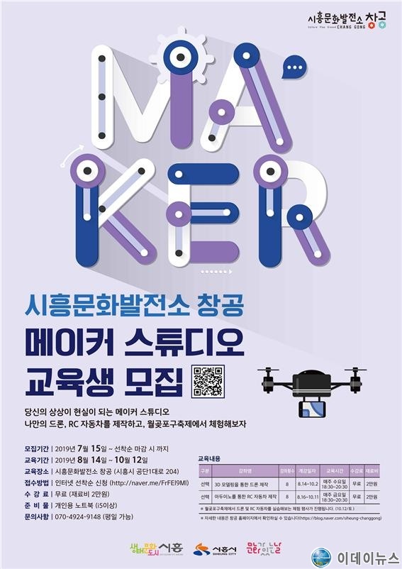 시흥시(시장 임병택)와 문화체육관광부는 ‘문화가 있는 날’ 사업을 통해 2019년 ‘메이커 스튜디오’ 프로젝트 참여자를 7월 15일(월)부터 선착순으로 모집한다.