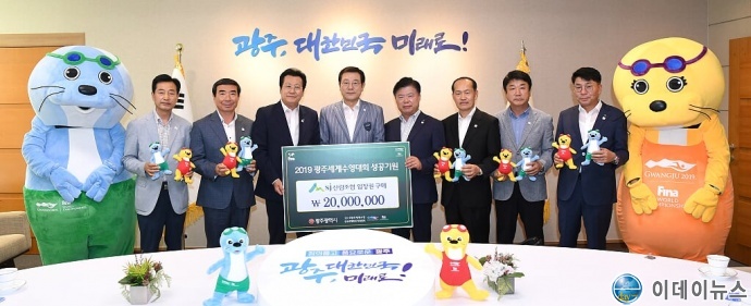 산림조합중앙회(회장 이석형)와 광주전남지역 산림조합협의회(회장 박진옥[완도군 산림조합장])는 2019년 7월 8일(월) 광주광역시(시장 이용섭)를 방문, 2019 광주세계수영선수권대회 입장권(2천만 원 상당)을 구매하고 대회 조직위원장인 이용섭 광주시장에게 입장권 구매증서를 전달하였다.