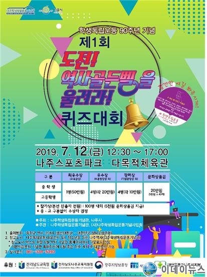 나주시(시장 강인규)와 나주학생독립운동기념관(관장 이명한)은 학생독립운동 90주년을 기념해 오는 12일(금) 나주스포츠파크 다목적 체육관에서 ‘제1회 도전! 역사골든벨을 울려라!’ 퀴즈대회를 개최한다.