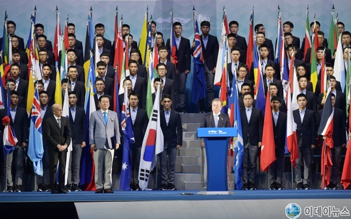 문재인 대통령이 12일 오후 광산구 광주여대 시립유니버시아드체육관에서 열린 2019 광주세계수영선수권대회 개회식에 참석해 개회 선언을 하고 있다.