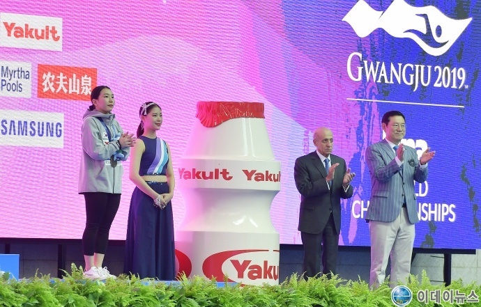 이용섭 광주세계수영선수권대회 조직위원장 겸 광주광역시장(오른쪽 첫번째)이 13일 오후 광산구 남부대 시립국제수영장에서 열린 2019 광주세계수영선수권대회 다이빙 여자 1m 스프링보드 결승에서 5차 시기 합계 257.20점으로 동메달을 획득한 김수지 선수에게 메달을 수여한 뒤 훌리오 마글리오네 국제수영연맹(FINA) 회장과 박수를 치며 축하하고 있다.