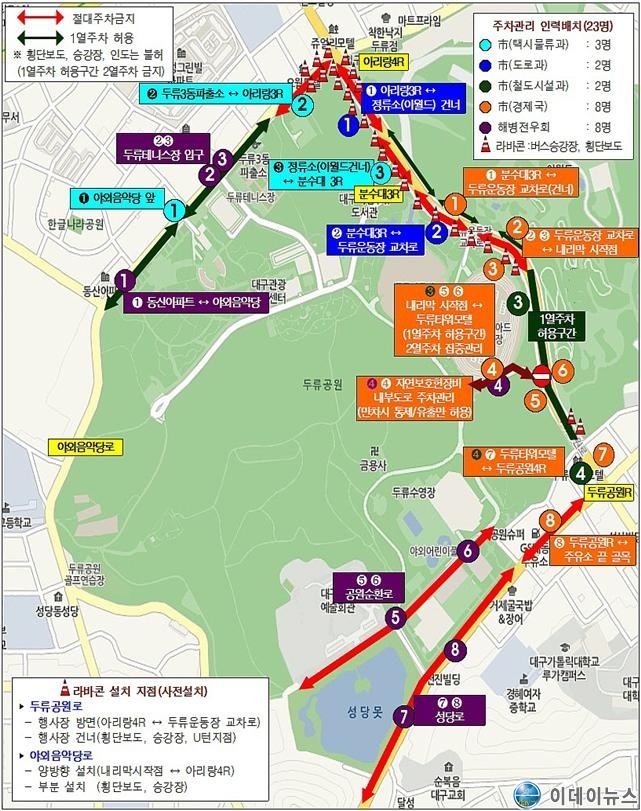 축제기간 중 많은 방문차량에 비해 주변 주차공간이 부족함에 따라 두류공원로 및 야외음악당로 일부 갓길을 임시주차장으로 허용할 예정이지만, 절대 주차금지구역(횡단보도, 승강장, 인도 및 라바콘 설치구간) 및 2열주차(1열주차 허용구간)는 순찰차 운영 및 계도인력을 배치하여 집중 단속할 계획이다.
