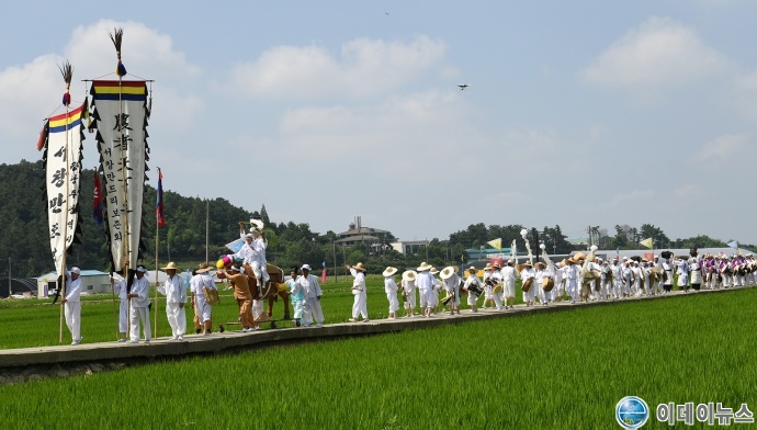 이 후 ‘농자천하지대본(農者天下之大本)’이 새겨진 농기와만드리기를 앞세운일꾼 등 100여명의 재현팀들이 논으로 이동해 소리꾼들의 소리와 함께 김매기를 실시한다. 김매기를 마친 머슴들은 황소를 타고 들노래를 부르며 마을로 들어오고,서대석서구청장은 농주가 되어 머슴에게 술과 음식을 권하며 격려한다.