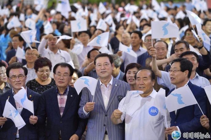 이용섭 광주세계수영선수권대회 조직위원장 겸 광주광역시장이 18일 오후 동구 금남로 5·18민주광장에서 열린 광주세계수영대회의 성공과 한반도 평화를 위한 '광주 평화손잡기' 행사에서 참가자들과 손을 맞잡고 평화를 염원하며 구호를 외치고 있다.