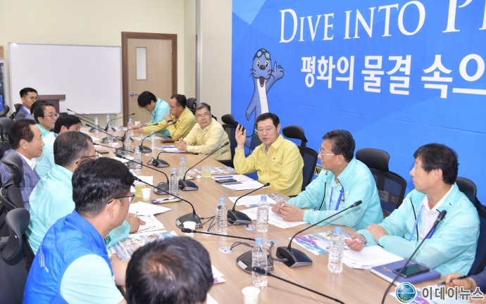 이용섭 2019광주세계수영선수권대회 조직위원장 겸 광주광역시장은 20일 오전 남부대학교 대회 종합상황실에서 제5호 태풍 다나스의 북상에 따른 종합상황점검 회의를 주재했다.