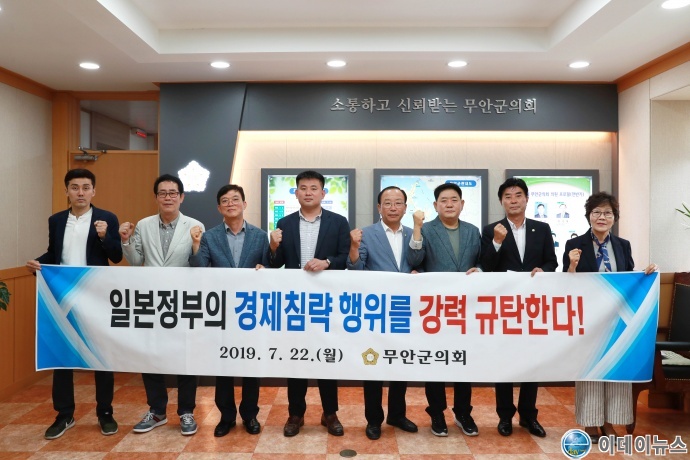 무안군의회(의장 이정운)는 22일 의원간담회를 개최하여 강제징용 피해자 배상판결에 대한 보복으로 일본정부가 취한 반도체 부품 및 소재의 수출규제 조치를 우리나라에 대한 경제 침략행위로규정하고 강력 규탄하는 결의문을 만장일치로 채택하였다.