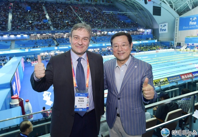 이용섭 광주세계수영선수권대회 조직위원장 겸 광주광역시장이 25일 오후 광산구 남부대 2019 광주 세계수영선수권대회 주경기장을 방문한 다미르 쿠셴 주한 크로아티아 대사를 접견한 뒤 기념촬영을 하고 있다.